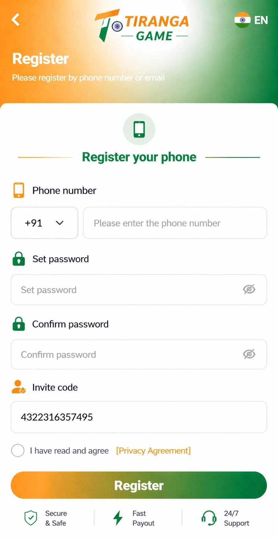 Creating a new account on Tiranga Game is quick and easy. Follow these simple steps to get started and enjoy exciting games along with attractive signup rewards.